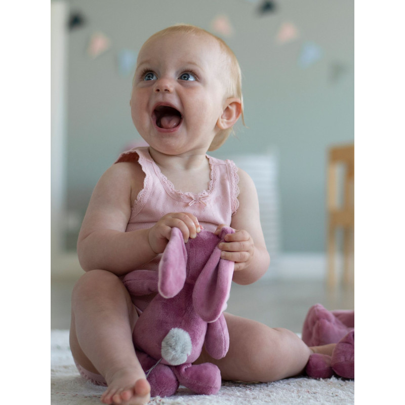 Den måler 30 cm og har fine lange ører, helt perfekt til at brodere navn på. Den overholder selvfølgelig alle EU krav til småbørns legetøj. I serie findes der også nusseklud med navn på.