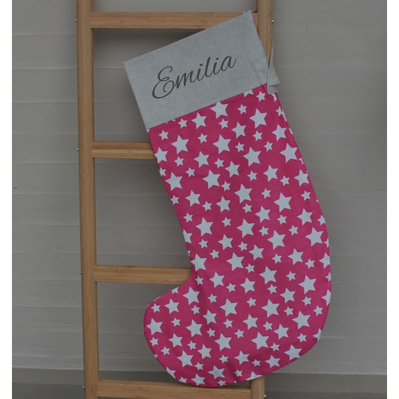 Stor pink julestrømpe med hvide stjerner og personligt navn – et unikt design med noget lidt anderledes. Denne julestrømpe er vores eget design og håndlavet fra bunden med stærke syninger, så den kan bruges år efter år. Der er hank i, så den nemt kan hænges op på pejsen, døren eller trappen.