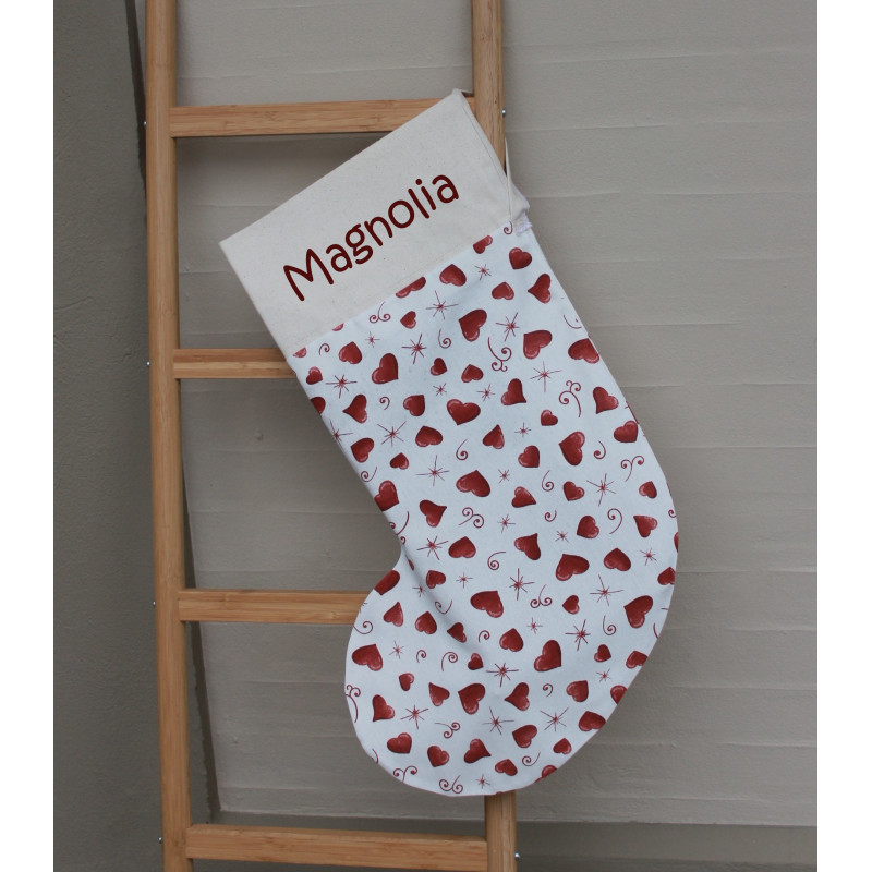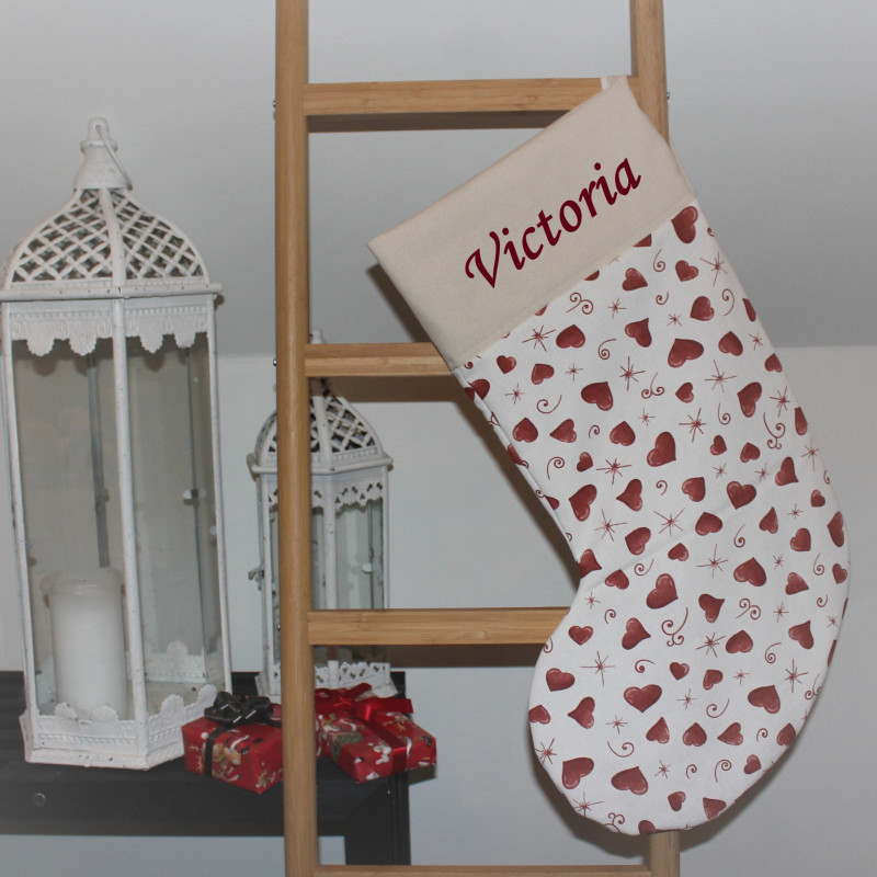 Sød hvid julestrømpe med røde hjerter og broderet navn på toppen. Håndlavet i god kvalitet med ekstra god plads til julegaver. Vælg navn, trådfarve og moti 60cm