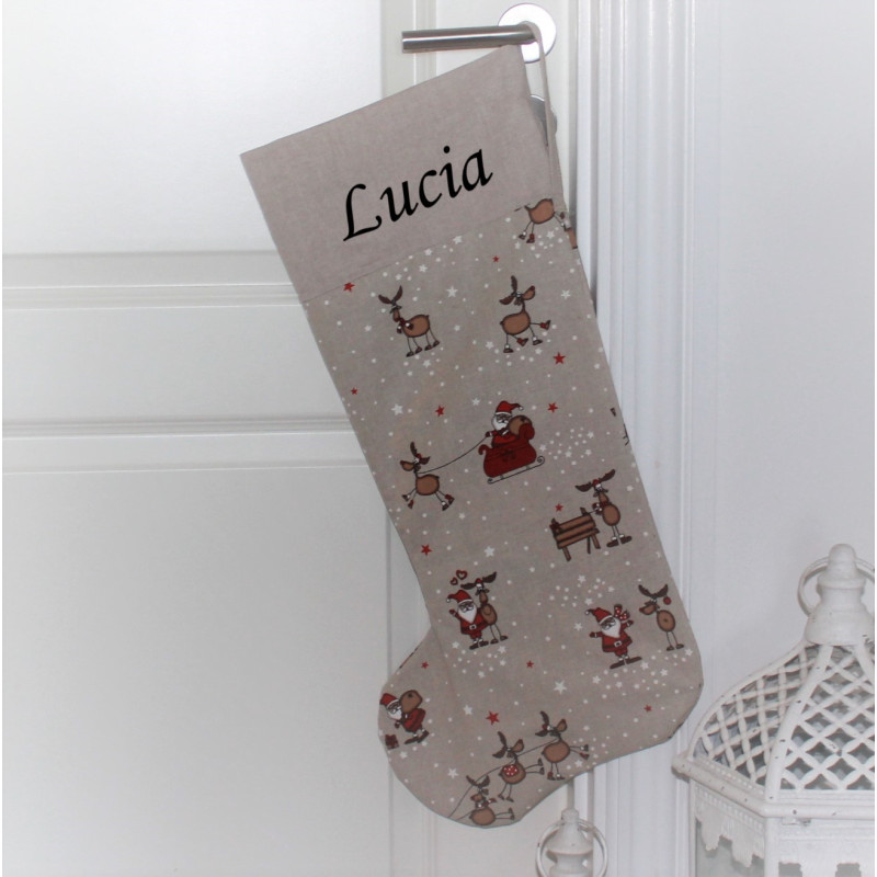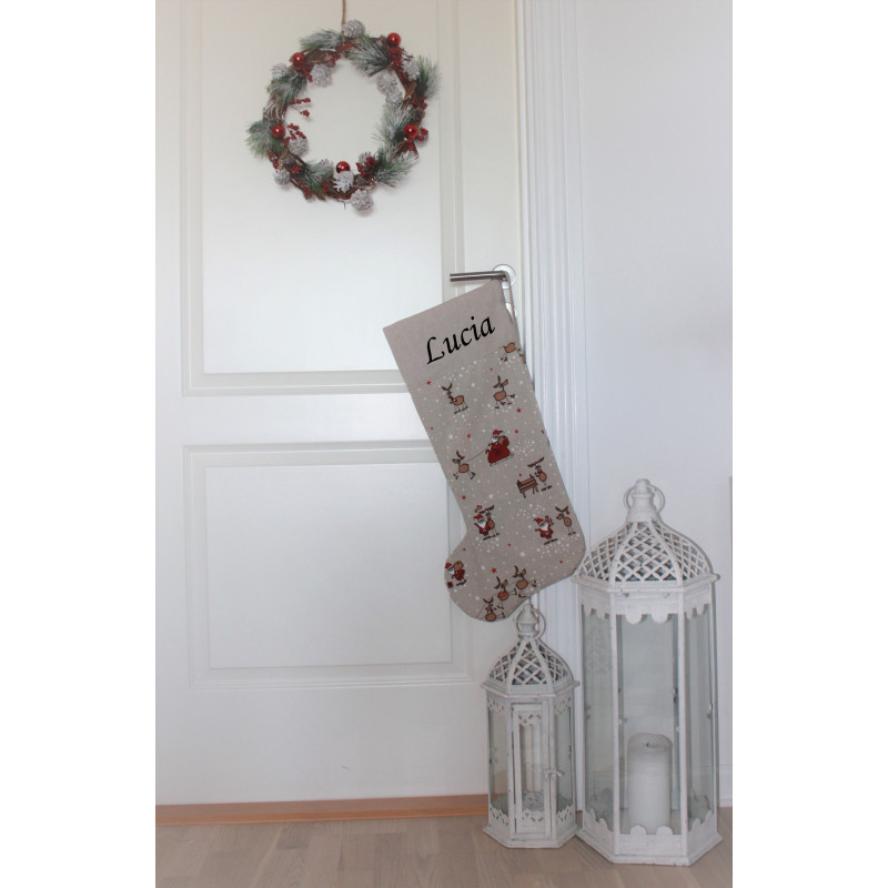 Stor julestrømpe med nisser, rensdyr, kane og navn på.