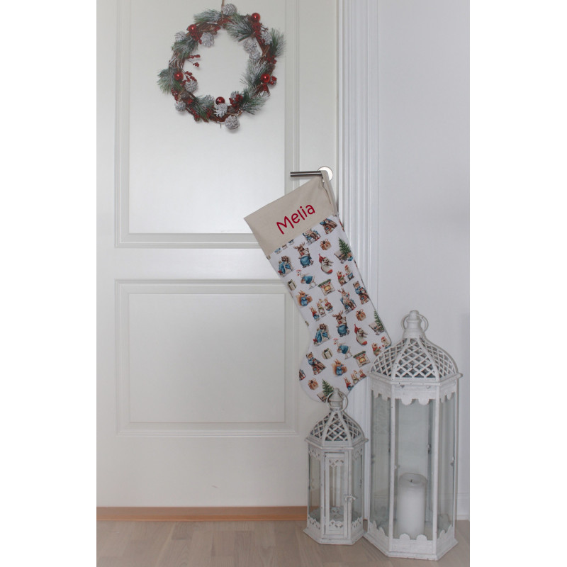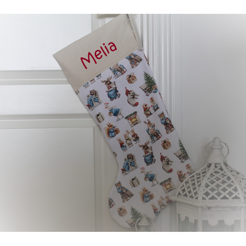 Julestrømpen er hvid med de skønneste dyremotiver af ræve, harer, katte, vaskebjørne gæs på. Den er i kraftig vævet bomuld og har en fin facon, der holder når den hænges op.