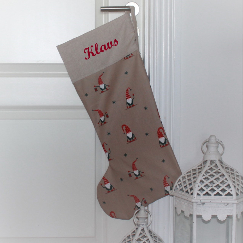 Julestrømpen broderes med personligt navn på det øverste stykke. Her kan der også broderes et motiv sammen med navnet. Det kan vælges i menuen.