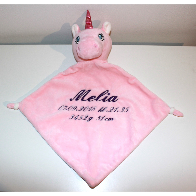 Den skønne enhjørning sutteklud måler ca. 40x45cm og er i blød god kvalitet. Den overholder alle EU krav til legetøj til børn fra 0 mdr. Den er lyserød med et sødt hoved med horn og pilleknuder i 2 hjørner.
