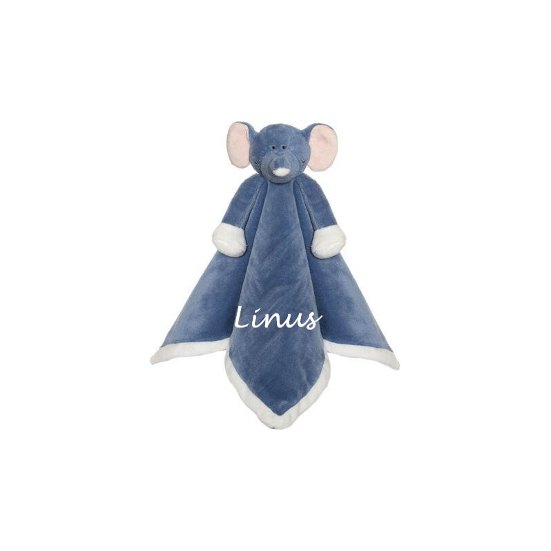 Teddykompaniet Dingliisar blå elefant nusseklud med navn på.