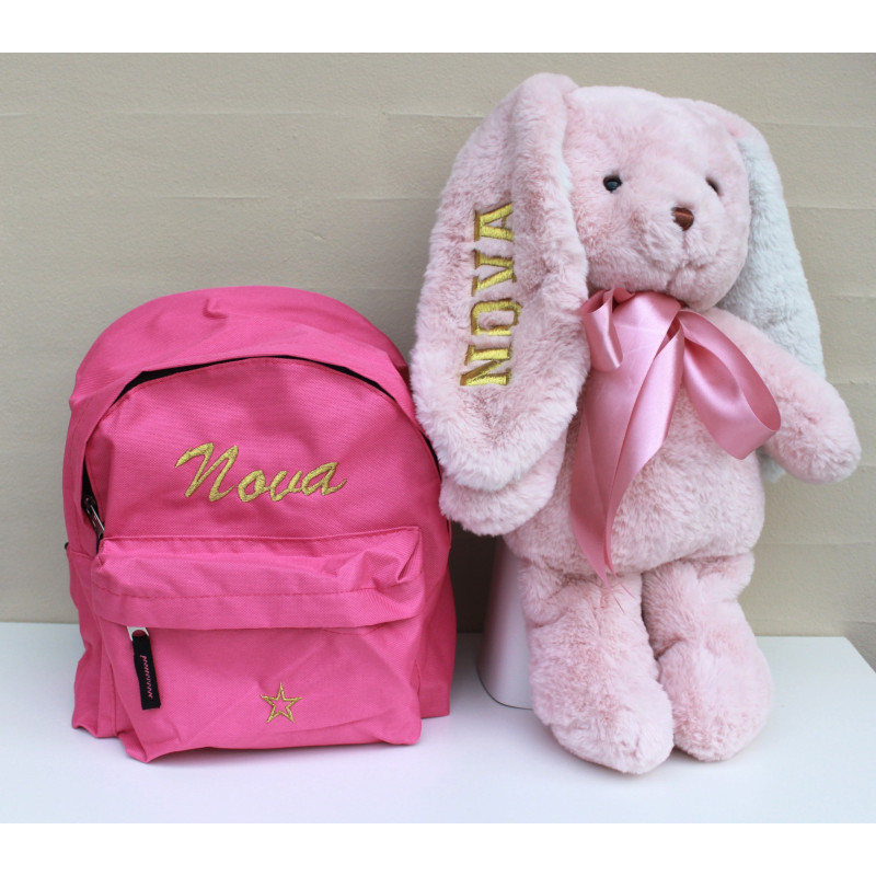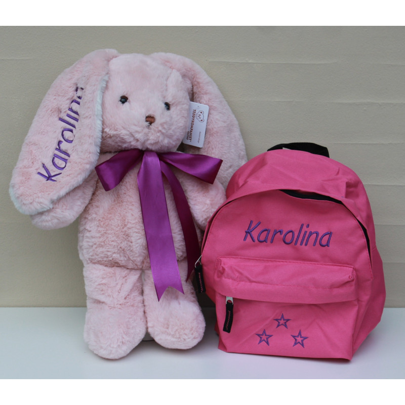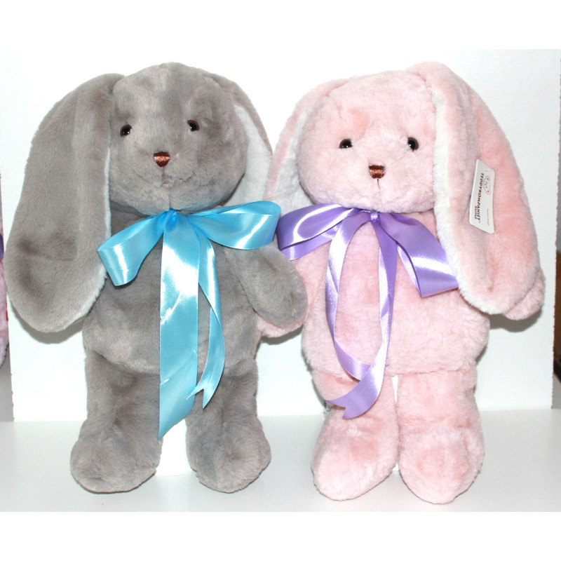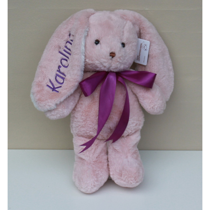 En skøn lyserød kanin med blød pels og store ører, som gør den ekstra hyggelig at kramme og holde om. Bamsen måler cirka 44 cm og er en favorit hos små børn, der elsker at tage den med overalt.